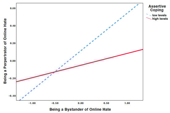 Simple slopes equations of the regression of online hate bystanders on online hate perpetrators at high and low levels of assertive coping.