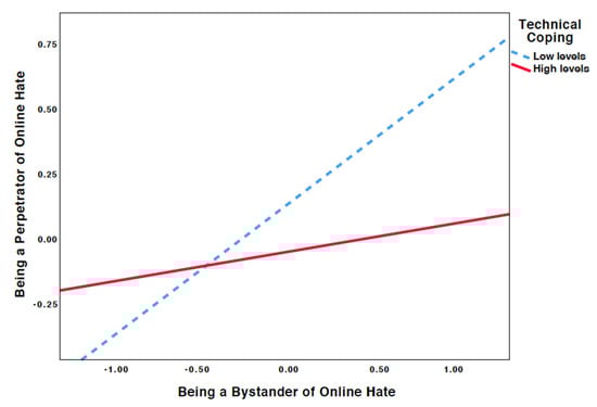 Simple slope equations of the regression of online hate bystanders on online hate perpetrators at high and low levels of technical coping.