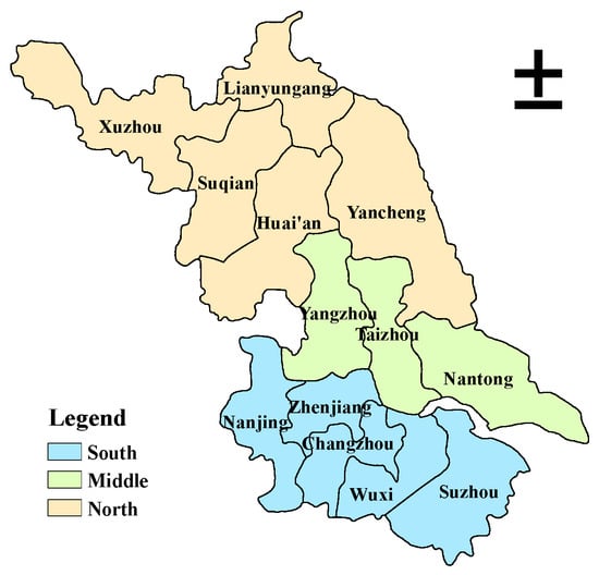 The first reason is the similarity of regional division and development gradient. As illustrated in Figure 1, Jiangsu can be roughly divided into three regions: the south of Jiangsu (hereinafter referred to as “South”), including Nanjing, Zhenjiang, Changzhou, Wuxi, and Suzhou; the middle of Jiangsu (hereinafter referred to as “Middle”), including Yangzhou, Taizhou, and Nantong; and the north of Jiangsu (hereinafter referred to as “North”), including Xuzhou, Lianyungang, Suqian, Huai’an, and Yancheng. These three regions correspond with Eastern China, Central China, and Western China, respectively.