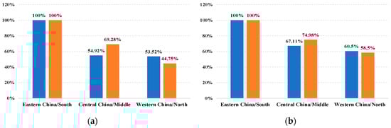 In parallel, the development gradient between regions in Jiangsu is also consistent with those in China. For the sake of convenience, per capita GDP and per capita disposable income of households are used to depict the development gradient. According to the data from the China Statistical Yearbook (2017) [] and Jiangsu Statistical Yearbook (2017) [], we take Eastern China and South as benchmarks, then the relative ratios of Central China, Western China, Middle, and North can be calculated, respectively. The results are shown in Figure 2. It is not difficult to see that the development gradients of the three regions in Jiangsu and in China are at an approximate level. Concretely, the development situation of Eastern China and South is far ahead, while the remaining four regions are relatively backward. Thus, both China and Jiangsu have the condition of “the rich first pushing those who will be rich later”.
