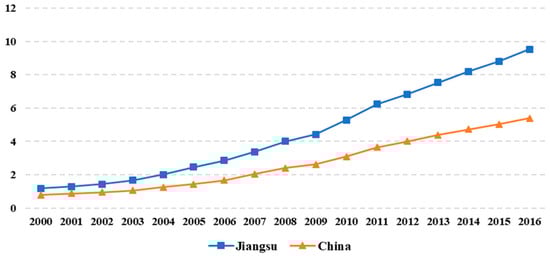 The second reason is that economic development is at the forefront. Exploring the path of development is the consistent requirement of the Central Committee for Jiangsu province []. Figure 3 illustrates the difference between the per capita GDP values of Jiangsu and China from 2000 to 2016. As can be seen, the per capita GDP of Jiangsu is always higher than those of the whole country, and the gap has an increasing trend, which indicates that Jiangsu can seize the opportunity for development and continuously improve people’s living standards. The experience of Jiangsu can be used for reference in other provinces, and even across the whole country.