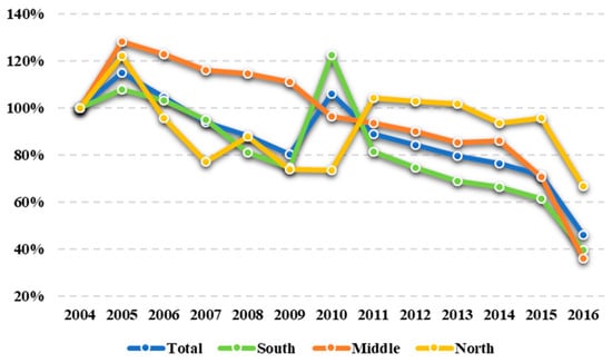 Figure 4 illustrates the change rate of industrial sulfur dioxide emissions in Jiangsu and its three regions during 2004–2016. In general, Jiangsu’s sulfur emissions showed a downward trend (except in 2005 and 2010), and by 2016, the emissions were only 45.85% of those in 2004, which indicates that the government has made good progress in controlling environmental pollution. From the regional perspective, the evolutionary trajectory in the South region is similar to the total, and the relevant sulfur emissions have decreased by 60.38% compared with those in 2004. The Middle region’s curve has a more obvious downward trend, and its emission reduction is the largest among the three regions (−63.90%). In addition, the variation of industrial sulfur dioxide emissions in the North region during 2004–2016 shows an approximate inverted “N” curve, and the emission reduction of this region is lowest (−33.40%).