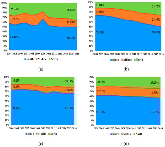 Figure 5 stands for the spatial distribution of industrial sulfur dioxide emissions, per capita GDP, gross industrial output value, and energy consumption. As shown in Figure 5a, the share of industrial sulfur dioxide emissions originating from South and Middle regions indicated a downward trend, falling to 50.46% and 12.88% in 2016, respectively, while those originating from the North region presented an upward trend and peaked at 36.65% in 2016. It is noteworthy that the industrial sulfur dioxide emissions in the South region have always accounted for a higher share, even exceeding the sum of the remaining regions. This suggests that the government may need to treat the South region as a management focus for industrial sulfur emissions.