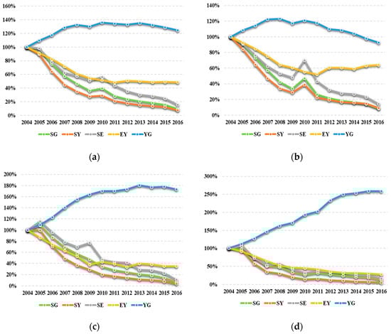With regards to the Middle (see Figure 6c) and North regions (see Figure 6d), the trends of relative indicators are also similar to those in the total region since 2004. Specifically, the variations of sulfur intensity of per capita GDP (−93.59% for Middle and −88.19% for North), sulfur intensity of gross industrial output value (−96.30% for Middle and −95.44% for North), and sulfur intensity of energy consumption (−89.37% for Middle and −83.43% for North) all support this viewpoint. On the other hand, energy intensity (−65.16% for Middle and −72.49% for North) and industrial structure (73.02% for Middle and 158.98% for North) in Middle and North regions changed more significantly from 2004 to 2016. Combined with Figure 6b, it can be inferred that the secondary industry in Jiangsu is more likely to transfer gradually form the South region to Middle and North regions.