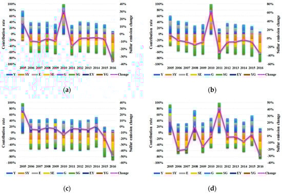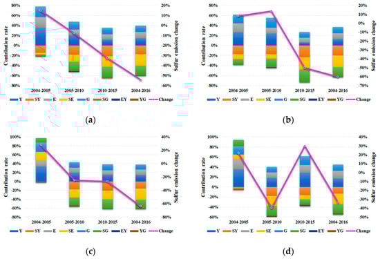 The contribution rates of the eight indicators and industrial sulfur dioxide emission changes in Jiangsu and its three regions at four stages: (a) total; (b) South; (c) Middle; (d) North.
