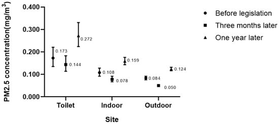 As the results show, the outdoor PM2.5 values were much higher than most of the other similar research, and the three-time waves of outdoor levels were significantly different, so the indoor PM2.5 concentrations did not decrease directly as other researches [33,34]. When adjusting outdoor background value, the PM2.5 level was slightly dropped three months later then slightly increased one year later but still lower than before legislation. The SHS in indoor public places declined following the reduction of smoking. Protano et al. also found the PM concentrations closely related with smoking in indoor places [35]. Male toilets had higher PM2.5 concentrates than indoor and its PM2.5 levels slightly but significantly increased one year later. The less but significant change of PM2.5 concentration is relative to our very low baseline number of cigarettes (0.25 (0.00~1.50)). The legislation had some effect on SHS in the venue, but it did not remove it completely and the SHS in male toilets even increased. When combined with our observational outcome that smokers in male toilets did not drop after the new laws were introduced, it is clear that smoking in toilets needs further attention by compliance enforcement.