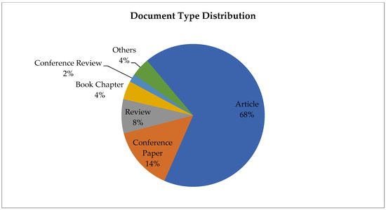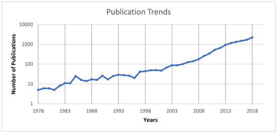 At total of 11,966 documents were obtained for the period of 1978–2018. Publications were diverse in type; the most common type of document was articles (68%), followed by conference papers (14%). The remaining types were reviews (8%); book chapters (4%); conference reviews (2%); and other types of documents (4%), such as books or notes (Figure 2). For the most common document, articles, the frequency was studied, and it was found that 82% were quantitative studies and 18% were qualitative studies. Most of the quantitative studies were cross-sectional studies (24%), followed by control trial studies (23%). These results are consistent with previous studies that have pointed out how quantitative articles are more common in the health field, with reviews or other documents being less commonly published [42]. As described by van Wesel M. (2016), the reasons for the higher number of articles may be related to a change of publication policy, author interest, or hot topic issues [43].