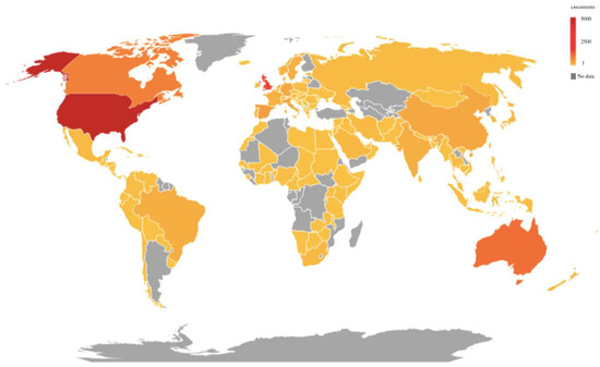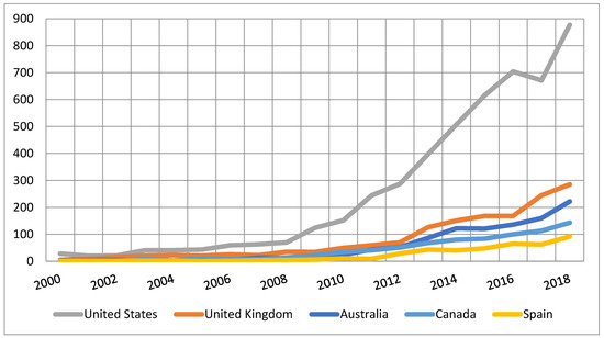Figure 5 shows the production of relevant articles per country between 1978 and 2018. Colors indicate the number of papers, from red (highest) to grey (no publications). The country with most publications was the United States (5205), followed by the United Kingdom (1577), Australia (1058), Canada (811), and Spain (423). Within these countries, the use of social networks has increased, and has even been potentiated by governments and institutions in order to promote healthy lifestyles or to provide group support for patients [48]. In the case of Spain, the increase of publications related to social media and health might be linked to the growth in environmental performance, social performance, and corporate governance performance since 2002 [49].