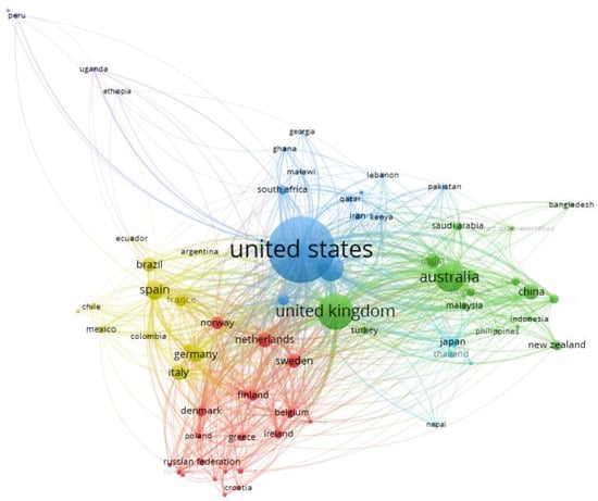 Three countries dominate in the six clusters seen in Figure 7 and Table 2, namely: the United Kingdom, the United States, and Australia. The first cluster comprises eastern European countries and Nordic countries, led by Finland. The green cluster, which is the second most crucial cluster, is led by the United Kingdom. The United Kingdom is the node of this cluster, because of the number of connections with other countries, and the number of publications. This cluster also includes Australia as the second most relevant nucleus, with a lower number of connections than the United Kingdom. All of the countries from this cluster seem to be connected via economic and political relationships.