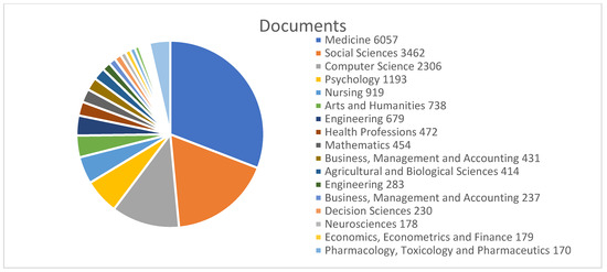 The frequency of publications by each thematic area was acquired from the Scopus database. In Figure 8, the distribution of the main thematic areas is represented. This figure shows that the area with the highest percentage of documents was medicine (50.7%), followed by social sciences (28.9%), computer sciences (19.2%), and psychology (10%). Areas such as agricultural and biological sciences (1.3%); engineering (1.6%); or pharmacology, toxicology, and pharmaceutics (1.4%) were less common in the database. The “other” (5.9%) category represents unspecified areas.