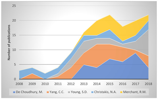 A further analysis was carried out based on the dominant authors in the field of social networks related to the health of the young. Table 6 and Figure 9 represent the scientific productions of the top five researchers focused on this subject during the last decade. De Choudhury, M. tops this field, with 35 documents over 10 years. Nevertheless, this author has an h-index of 28, lower than Christakis, N.A., with an h-index of 71, and Merchant, R.M., with an h-index of 32. Following this, according to the h-index, was Yang, C.C. with 23 and Young, S.D. with 22. Although De Choudhury, M. has a lower h-index compared to Christakis, N.A. or Merchant, R.M., the total number of documents published by this author, 2776, is higher than for any of the other authors.
