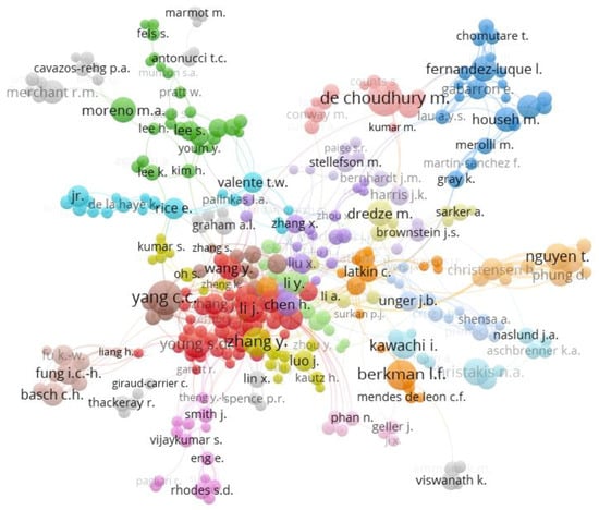The second significant finding was that collaboration between authors and countries seems to be led by the United States, acting as the standard connection between countries and authors. Based on this, significant countries in terms of health prevention measures and the health system, as well as the number of inhabitants, might be linked to the prevalence of studies on the role of social networks in health interventions and as a risk factor [60,80,81].