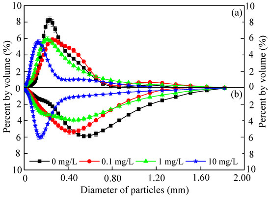 Figure 1 clearly showed the size distribution of sludge under CeO2 NP stress. The particle size distribution ranges concentrated between 0–1.5 mm were similar in the exposure period to different CeO2 NP concentrations. The sludge size increased from 0.274 mm to 0.495 mm in the control reactor, indicating the sludge was granulated. It can be seen that the sludge particle size had increased under the long-term effect of CeO2 NPs, but remained smaller than the average particle size of the control, in the comparison in Figure 1a,b. This can probably be attributed to the presence of nanoparticles, which can activate sludge by stress and inhibit the growth of particle size. Meanwhile, dissolved nanoparticles tended to be adsorbed on the surface of the activated sludge, making it expand, which could be observed evidently in reactor 1 (R1) at the concentration of 0.1 mg/L. This can be interpreted as the presence of high-concentration nanomaterials easily being able to induce self-aggregation and thus reducing the positive contact with sludge.