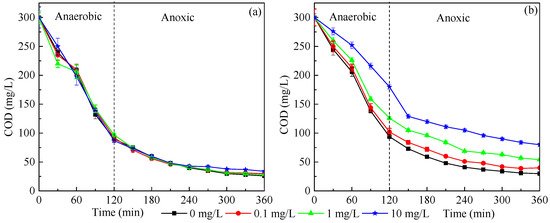 Variations of chemical oxygen demand (COD) in one cycle after 1 day (a) and 10 weeks (b) of exposure to 0 (black), 0.1 (red), 1 (green), and 10 (blue) mg/L CeO2 NPs, respectively. Error bars represent standard deviations of triplicate measurement.