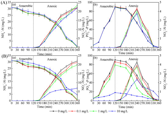 Effects of CeO2 NPs on the variations of (a) NH4+-N (full) and NO3−-N (blank), (b) PO43+-P (full) and NO2−-N (blank) during one cycle after 1 day (A) and 10 weeks (B) of exposure to 0 (black), 0.1 (red), 1 (green), and 10 (blue) mg/L CeO2 NPs, respectively. Error bars represent standard deviations of triplicate measurement.