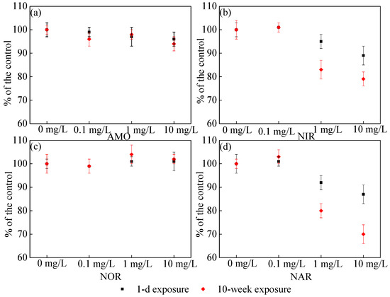 In order to further explore the mechanism of the effects of CeO2 NP exposure on microbial performance in SBRs, the effects of different concentrations of CeO2 NPs on the activity of key enzymes related to the nitrogen and phosphorus removal process are displayed in Figure 4. It can be seen from Figure 4a that the relative activity of AMO was inhibited under the long-term high concentration of CeO2 NPs exposure, which would lead to the reduction of NH4+-N conversion rate. However, from Figure 4c, the relative activity of NOR was slightly higher than that of the control group, indicating that the transformation of NO2--N to NO3--N was not hindered. These two effects together led to the reduction of nitrite accumulation. In general, the results of the enzyme activity measurement were consistent with the tendency of nitrogen and phosphorus removal shown in Figure 3. CeO2 NPs were vital in the activity of key enzymes related to nitrogen removal. It was reported that AMO and NOR played an important role in nitrification, and denitrification was related to NAR and NIR [28,29]. The relative activity of NIR was 79.00% under 10-week exposure and 89.00% under 1-day exposure, together with the 70.00% and 87.00% of relative activity of NAR under the same conditions, respectively (Figure 4), in which the variation tendency coincided with Figure 3. Compared with NAR and NIR, the activities of AMO and NOR did not change significantly, which may indicate that NAR and NIR were more sensitive to CeO2 NPs on a longer time scale.