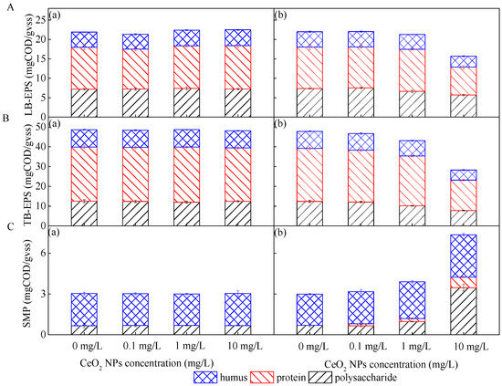 - In the early period of CeO2 NP exposure, the content of EPS increased compared with the control; however, at the end of the exposure stage, the content of EPS decreased significantly and the toxicity response of TB-EPS to CeO2 NPs was more sensitive than that of LB-EPS. The increase in SMP production was considered to be an autonomous way for microorganisms to cope with toxicity at the end of the period of 10-week exposure.