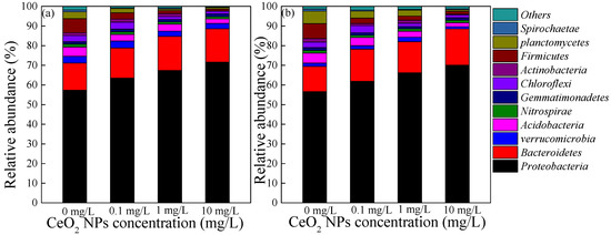 The shift of the microbial community at the phyla level in damaged sludge before (a) and after (b) the two-week recovery period after relief from different CeO2 NP concentrations.