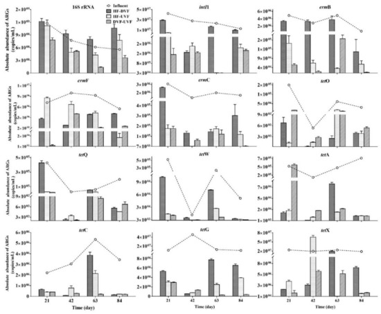 - Sui, Q.; Zhang, J.; Tong, J.; Chen, M.; Wei, Y. Seasonal variation and removal efficiency of antibiotic resistance genes during wastewater treatment of swine farms. Environ. Sci. Pollut. Res. 2017, 24, 9048–9057. [Google Scholar] [CrossRef]