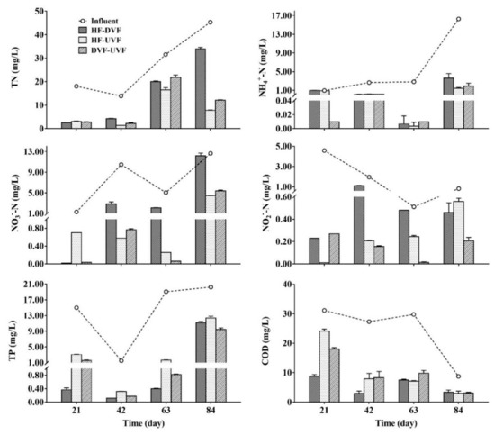 The nutrients concentrations in the influent and effluent of three hybrid CWs have been shown in Figure 3. During an operation period of 84 days, the nutrients concentrations presented high variability and the average influent concentrations of TN, NH4+-N, NO3--N, NO2--N, TP, and COD were 27.20, 5.69, 7.37, 1.97, 13.96, and 24.24 mg/L respectively. In effluents, TN, NH4+-N, NO3--N, and NO2--N were detected at the concentration of 1.03–33.99, 0.00–3.60, 0.02–12.17, and 0.01–0.56 mg/L, respectively. All three hybrid CWs showed quite good removal effects on nutrients, with the average removal efficiencies of 54–76% for TN, 68–95% for NH4+-N, 59–86% for NO3--N, and 47–90% for NO2--N (Table 1). The HF-UVF presented relatively higher average TN removal efficiency compared with other two CWs (p > 0.05), while DVF-UVF had the highest average removal efficiencies of NH4+-N, NO3--N, and NO2--N (95%, 87%, and 90%, respectively) among three hybrid CWs.