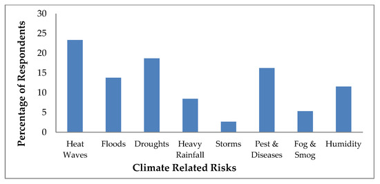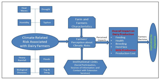 In Pakistan, dairy farmers are very much concerned about climatic risks and its variability. Their past experience expose that they are well aware of occurrence and severity of climate. It is difficult to comprehend the nature of climate that poses a major threat for dairy production system as well as livelihoods of farmers [7,64]. According to [65], changes in the dairy production system that are associated with the climate change are important factors, for example, economically. Therefore, researchers believe that it is essential to know the perceptions of dairy farmers about climate related risks, as this may provide a profound familiarity with susceptible nature of farmers and their adaptation behavior.