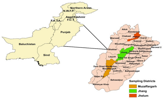 The research was carried out in the Punjab, which is the second largest and the most populated province in Pakistan and located in the semi-arid low land region [39]. The geographical area of Punjab has 20.63 million hectares, in which 59% area is under cultivation. Reason being selecting this province includes that Punjab contributes its share of 54% and 62% in the national GDP and national agricultural sector [40]. Punjab has the largest buffalo and cow population, at 16.019 million and 13.204 million in total livestock population, respectively. Punjab is also the major milk producing province with annual production of 36.23 million liters, which is about 67% of total milk production in Pakistan [22]. Mixed cropping along with livestock rearing is the common practice of farmers in Punjab [41,42]. In Punjab, the average minimum and maximum temperature per annum has been in range of 16.52 °C to 21.50 °C and 30.09 °C to 32.75 °C between the periods 1980–2018. In Punjab, 50% to 75% rainfall is linked with the monsoon season that lasts from June to August each year. The Pakistan Agriculture Research Council (PARC) map bifurcates Punjab into different agro-ecological zones, as depicted in Figure 2, and each zone has different rainfall pattern. Rain-fed and irrigated zones of Punjab receives the highest and lowest rainfall respectively [43]. Keeping this in mind, three districts from three different agro-ecological zones were selected for purposes of this study.