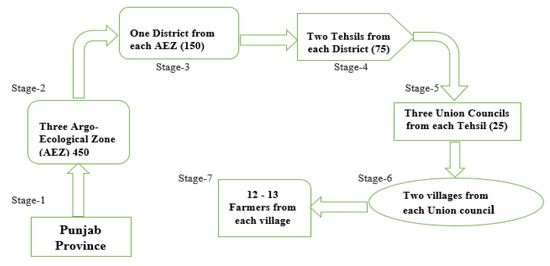 A field survey was carried out to collect cross sectional data from September to December 2018. A well designed and structured topic guide/questionnaire was used to draw the valuable data by interviewing dairy farmers/respondents. A multi-stage stratified random sampling procedure was applied as shown in Figure 3. In the first stage, study region was selected and for this purpose, map of PARC indicating agro-ecological zones of Punjab province was used. The Punjab province is divided into four agro-ecological zones which are irrigated plains (low intensity rain-fed area), mixed cropping zone (moderate rain-fed area), Barani (high intensity rain-fed) region and Thal region (desert area). Researchers selected the first three zones. In the second stage, total three districts consisting of one district from each zone by considering the homogeneity and heterogeneity of climatic variability, cropping pattern and irrigation systems and cattle breed were selected. From each district, two random cities (tehsils/sub-district) were selected at third stage and in next stage, from each city; three union councils (UCs) were chosen for study purpose by considering distance between UCs and distance from the UC to the main city. According to the Government of Pakistan administrative system, each UC has some villages and in the last fifth stage, from each UC, two villages were chosen. Twelve to thirteen dairy farmers were approached for interview without considering the size of their land holdings and farm location. On the whole, 450 farmers and out of which 150 were interviewed from each selected district.