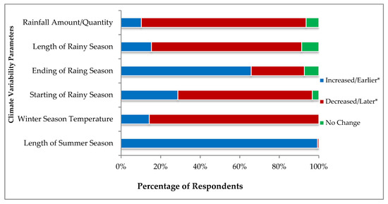 The farmer’s perception about climate variability is observed as overall understanding of the following climate parameters. During the survey, the question was raised to the dairy farmers as to whether they have perceived some fluctuations in precipitation and temperature during last decade and either the length of summer season has increased, decreased or there has been no change during the last decade. Simultaneously, the same approach was used for getting perceptions about the temperature in the winter season, while for the rainy season, we inquired that either monsoon has been started earlier, later or continuing on the same pattern during the said time period. All the responses reported by the surveyed farmers are summarized in Figure 5.