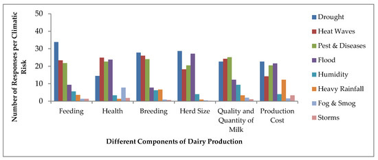 Keeping in view the awareness level of farmers about climate variability, researchers further tried to find out that how farmers perceive the risks against dairy production system. In South Asian countries, the huge population (25% of Global Population) of dairy animals is exposed to climate change, but it has not been recorded properly [75]. Furthermore, farmers in these countries believe that indigenous breed of cattle and buffalo have the natural ability to adjust themselves with hot and humid environment. Although several researchers have focused their intentions on the biological functions of dairy animals and found that climatic factors like heat waves have more vulnerable effects [18,51,76,77]. In this study, farmers understand the nature of climate related risks by observing productivity and changes in physical conditions of animals. Dairy farmers are very experienced to identify the impact of climate related risks on dairy animals through their observation, as some of them quoted that “animals do not tell a lie”. They can easily observe some special signs that appeared in animals to identify either they are sick or trapped by heat stress because the “body language of animals always speaks to them”. Farmers are more certain to report that which particular aspect of dairy production system is affected by climate related risks that ultimately leads to enormous damage their farm productivity as well as their revenues. Feeding and animal’s health are the two major aspects of the dairy production system that are highly affected by climate-related risks. On the other hand, milk quantity and quality is severely diminished due to pests and infectious diseases, droughts and heat waves.