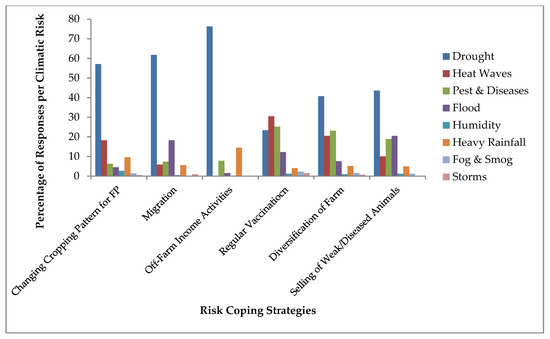 Most of the farmers, about 75%, earn an income from selling their labor to non-agricultural activities in cities, in this way they spread the risk and also enables them to invest in their farm in the near future. They diversified their income by working as daily laborer, petty traders, and construction worker or in some industry as wage earner, so income from these activities enables farmers to modernize their production system during unexpected hazards [59,60,61]. Heat waves, pests and diseases, droughts and floods are the major risks which cause the increase of infectious disease and parasite occurrence in cattle. Therefore, farmers use regular vaccination during these climatic risks. Famous livestock breeds and crops cultivars are more resistant against heat waves and droughts. Such strategy of diversification enhances animal productivity during high spells of rainfall and temperature. Furthermore, such diversification in variety of crops and animal species (for meat purpose) is an effective way to combat climate-related diseases and pest outbreaks [7,62,63]. About 45% of farmers sell their animals when they become weak or diseased, particularly during the drought situation when fodder and water shortage increased and they have to buy it from market. Marginal farmers adopt this strategy frequently as they were not able to feed and vaccinate their diseased animals due to lack of financial resources [9].