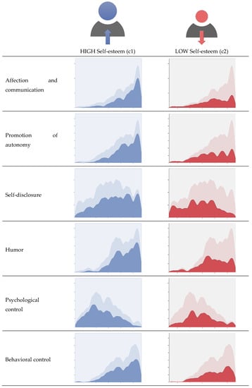 The second cluster (c2), with 41.6% of the cases (n = 235), was characterized by low self-esteem, scores below the sample mean in affect and communication (M = 12.26), promotion of autonomy (M = 11.98), self-disclosure (M = 9.49), humor (M = 12.05), and behavioral control (M = 12.64); and a score above the mean in psychological control (M = 9.82).