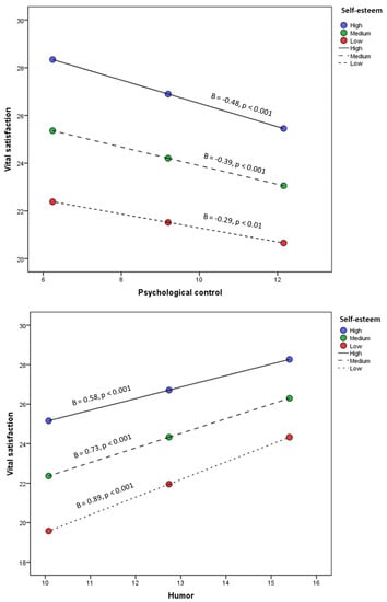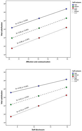 In line with the proposal by Hair, Anderson, Tatham, and Black [60], when moderating relationships are entered, the interpretation of the regression coefficients may be modified. Based on the simple moderation models, the coefficients were estimated for the effects of each of the independent variables (affect and communication, self-Disclosure, psychological control, and humor), of the moderator (self-esteem), and the interaction term on the dependent variable (life satisfaction) in each case.