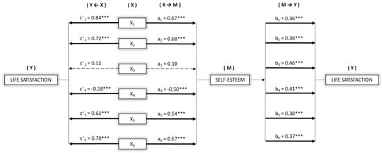 Mediation models for self-esteem on the relationship between parenting practices and life satisfaction. Note. X1 = Affection and communication; X2 = Promotion of autonomy; X3 = Behavioral control; X4 = Psychological control; X5 = Self-disclosure; X6 = Humor. *** p < 0.001.