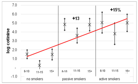 Figure 1 display an evident V-shape distribution of log Cotinine values sub-grouped according to the three age groups, which shows a substantial decrease in the intermediate age group. In particular, the findings relative to the intermediate age group (11–15 years) underscore the importance of the role played by the growth process in the respiratory health of a mature individual. This particular role in growth-period processes is indeed characterized by a particular hormonal change triggering the activation of enzyme systems, and this seems to give an acceleration of enzyme systems and to protective metabolism. This, in turn, enhances the hormonal and metabolic action, likely lowering the concentration of the analytes measured in this study and yet to be investigated with future longitudinal studies [34,35].