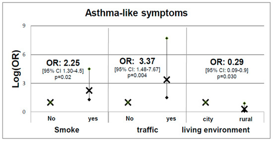 Logistic regression analysis using asthma-like symptoms as the dependent variable and tobacco smoke exposure, traffic, and living environment as independent variables, adjusted for age and gender. For each groups the figure reported the mean (×) and the predictive margins (•).