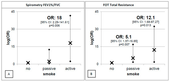 With regard to the first model depicted in Figure 2, asthma-like symptoms were more frequently found in children exposed to tobacco smoke (OR = 2.25 (95% CI: 1.30–4.50); p = 0.020) or living in high-traffic areas (OR = 3.37 (95% CI: 2.29–141.61); p = 0.004). In contrast, living in rural areas seems to have a moderate protective role in terms of respiratory health in the subjects considered (OR = 0.29 (95% CI: 0.09–0.90); p = 0.030). The negative role of tobacco smoke is also confirmed in the second GLM model (Figure 3), which shows how FEV1/FVC and FOT parameters are negatively influenced upon tobacco smoke exposure as this latter increases substantially the FEV1/FVC ratio (OR = 18 (95% CI: 2.29–141.61); p = 0.006) but only in active smokers. Furthermore, Figure 3B shows how tobacco smoke exposure worsen significantly FOT R5-tot (OR = 5.1 (95% CI: 1.57–16.85); p = 0.007) and active smokers (OR = 16.8 (95% CI: 1.68–87.27); p = 0.013) (Figure 3B), indicating a better sensitivity of FOT with regard to early damage to respiratory pathways. No significant relationships were detected between non-normal FVC and FEV1 and smoke exposure, traffic, and living environment.