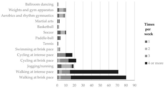 In this study, 78.5% of the people interviewed had engaged in some type of LTPA during the week before the survey was conducted; 38.6% of the sample reported that they carried out a single type of LTPA. The percentage decreased when the number of different PA activities increased; consequently, only 17.8% of autochthonous young adults from Seville performed at least three types of PA. A description of the types of PA can be seen in Figure 1. From these results, we highlight that four or more times a week 64.3% of the sample walked at a brisk pace and 56.2% walked at an intense pace. Furthermore, 10.8% of the participants went running twice per week; 9.8% practised cycling at a brisk pace three times a week. In addition, 4.9% of the sample played soccer twice a week, 4.6% practised aerobics and rhythmic gymnastics, and 5.1% used weights and gym apparatus with the same weekly frequency.