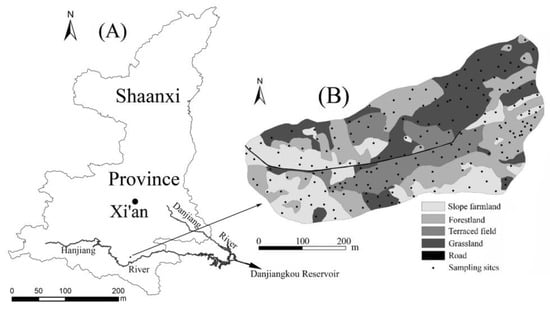 (A) Study area in Shaanxi province, China; (B) sampling sites and their land-use types.