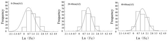 Data must be tested for normality before geo-statistical analysis. According to the kurtosis and skewness coefficients and the K-S (Kolmogorov-Smirnov) test reported in Table 1, soil iron does not satisfy a normal distribution for the three soil layers [29]. This was the case because in the process of soil formation, due to the influence of external factors, the soil characteristics changed and soil iron moved and redistributed, changing the original uniform distribution. Therefore, the data was subjected to a logarithmic transformation. After transformation, the p-values of the K-S test were 0.082, 0.117, and 0.141, showing that the data at the three depths were normally distributed (p > 0.05). Histograms of soil iron at different soil depths are shown in Figure 2.