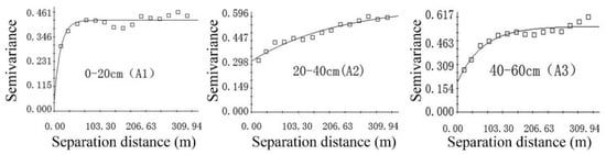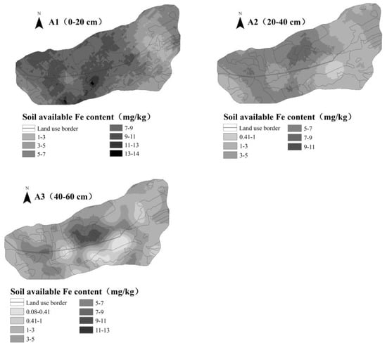 The coefficients of variation (CV) for the A1, A2, and A3 soil layers were 59%, 75%, and 59%, respectively. According to Nielsen and Bouma [28], the variability of soil iron in the three soil layers is moderate and increases with increasing depth. This indicates that the spatial variation of soil iron is moderate and that the degree of dispersion increased with soil depth; human disturbance also gradually increases soil iron [20].