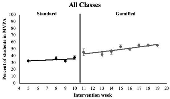 Figure 2 displays the average percentage of students participating in MVPA during an activity break during the standard and gamified intervention weeks. For all classrooms combined, at the start of the standard intervention, 25.3% ± 0.20% of students were engaging in MVPA during an activity break. There was a significant effect of intervention, with a 27.3% ± 0.11% increase in student engagement in MVPA during an activity break during the gamified intervention weeks compared with the standard intervention weeks (p = 0.03). During the gamified intervention, there was a 4.9% ± 0.04% increase in MVPA participation per week, however, this change was insignificant (p > 0.05).