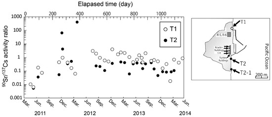 Time series seawater monitoring by TEPCO of 90Sr near the FDNPP was infrequent compared to that for radiocesium [3,6]. Povinec et al. [3] showed that the 90Sr/137Cs ratio in seawater at a monitoring point near FDNPP increased gradually from 0.01 to 1 between April 2011 and February 2012 (Figure 1), which clearly related with decontamination of stagnant water. The transient increase of 90Sr in seawater at the T2 site observed in December 2011 could reflect the leakage event from the 137Cs decontamination system [4]. After 2012, the 90Sr/137Cs ratio remained at a constant value around 0.5 at the T2 site with large variability. 90Sr/137Cs activity ratios in stagnant water have varied depending on the decontamination of 134, 137Cs. The agreement between the temporal variation of 90Sr/137Cs activity ratio and decontamination of the stagnant water supported the idea that the most probable candidate was the continuous release from reactor buildings of the FDNPP.