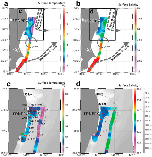 Maps showing sampling locations. (a) Surface temperature and (b) salinity had two boundary currents (dashed arrows), the warm northeastwardly Kuroshio current south of the Boso Peninsula and the cold southerly first branch of the Oyashio current off the Fukushima coast. (c,d) Sampling locations are marked by red circles and located near the coast of Fukushima Prefecture.