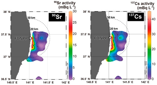 The behavior of 137Cs in seawater and biota after the accident has been well documented [7,8,9,10,11]. High-density sampling of surface seawater to determine radiocesium activity [12] has been carried out. Kumamoto et al. [13] reported detailed vertical distributions of Fukushima-derived radiocesium along the 149 °E meridian in the western North Pacific. However, distributions of 90Sr derived from the FDNPP in the sea have been studied to a significantly lesser extent [3,6,14,15,16,17]. Castrillejo et al. [17] suggested that continuous release of 90Sr from the FDNPP was occurring in September 2013 based on simultaneous observations of 90Sr and 137Cs. The estimated release rate of 90Sr was 2.3–8.5 GBq day−1, which was 2–3 orders of magnitude larger than river inputs.
