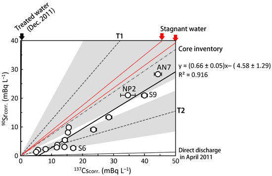 The slope of a linear regression fitting (0.66) was similar to the reported 90Sr/137Cs activity ratios in stagnant water of 0.78 and 0.88, respectively, in July and August of 2013 [5]. The stagnant water samples were collected from the sampling line behind the mixing point of water from each reactor building [4,5] (Figure 5). These radionuclides were thought to mainly be derived from the reactor building of unit 2 on the basis of the initial data for stagnant water in the unit 2 turbine building [2], which was severely damaged. The 90Sr/137Cs activity ratio in stagnant water varied depending on the decontamination of 134, 137Cs, and gradually increased from the direct-release event in March 2011 (0.0256 ± 0.0006 [15]). The 90Sr/137Cs activity ratio of seawater in this study is slightly lower than that of stagnant water, although the most possible source candidate is the continuous release of stagnant water from the FDNPP.