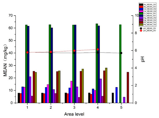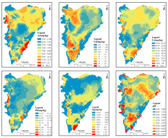 For the purpose of understanding the spatial distribution regularities of the different metal(loid)s, the kriging interpolation method of the geostatistical module in ArcGIS was used to assess the metal(loid) concentrations in each type of soil in the study area. Based on this, a spatial distribution map of the heavy metal concentrations in the soil was created (Figure 4). The spatial distributions of Cr, Pb, Cd, As, and Hg, as well as the pH of sampled areas showed an increasing or decreasing trend, and all these attributes had obvious high-value areas. All metal(loid)s showed high values in the south-eastern area, possibly due to phosphate mining. The concentrations of Cr, Pb, and Hg were generally low in the study area. While Cr was clustered in several small sites of the north-eastern area, possibly due to local paint factories, the concentration of As was high in the north-western area possibly due to building material and paint factories. High Hg concentrations were found in the south-eastern area, mainly due to mining plants, and Cd was mainly distributed in the southern area due to cities and mines, and in the north-western area due to agriculture, especially vegetable fields. Lead and Cr were mainly distributed in the western area, possibly due to agricultural production rather than industry and mining. Since long-term vegetable planting caused soil acidification, high pH values (Figure 5) were found to be negatively correlated with the spatial distribution of vegetable fields (Figure 4).