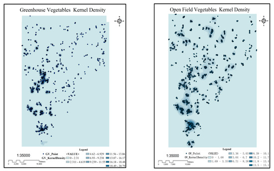 The probability density of different vegetable field types in the study area was obtained by kernel density analysis method. The centroid of each polygon was extracted as the point data for the kernel density calculation. The default search radius (bandwidth) was calculated based on the spatial configuration and number of input points. The bandwidth was calculated by dividing the minimum value of the width or the height of the output range in the study area by 30. For example, the east-west width of the study area is 47,670 m, and the default bandwidth is 1589. This approach to calculate the default radius generally avoids the “ring around the points” phenomenon that often occurs with sparse datasets. This approach corrects for spatial outliers—input points that are very far away from the rest—so they will not make the search radius unreasonably large. The results show that both vegetable fields have spatial agglomeration characteristics, mostly around villages and towns (Figure 6).