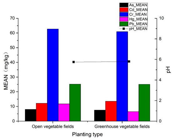 Open vegetable fields had lower soil pH and higher soil As, Cr, and Hg concentrations than GV fields in the same area. Only OV fields of levels 2, 3, and 4 had lower Cd and Pb than GV fields in the same area. Heavy metal pollution in the OV fields was more severe than that in the GV fields. Moreover, OV fields were subject to the external environment, resulting in the loss of metal(loid)s (Figure 9).