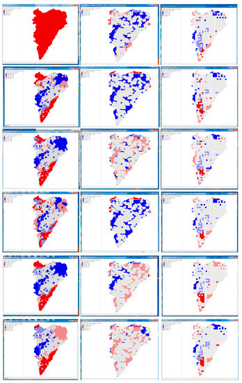 Bivariate local Moran’s I distribution maps for metal(loid)s and pH in different GRID (Left 500 m, Middle 1000 m, Right 2000 m, and Rows 1 to 6 were As, Cd, Cr, Hg, Pb, and pH).