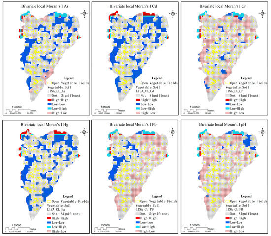 Bivariate local Moran’s I distribution maps for metal(loid)s and pH by 1 × 1 km Unit.